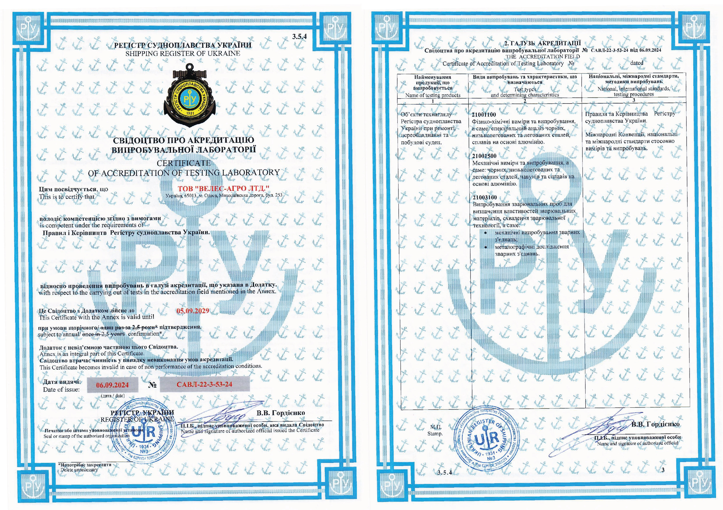 Prüflabor der LLC „VELES-AGRO LTD.“ erhielt vom Schifffahrtsregister der Ukraine ein Akkreditierungszertifikat, das seine Kompetenz und die Einhaltung der Anforderungen internationaler Standards für Tests im Bereich physikalischer, chemischer und mechanischer Messungen bestätigt. Das Labor verfügt über die notwendigen technischen Ressourcen und qualifiziertes Personal, um Prüfungen in den folgenden Akkreditierungsbereichen durchzuführen:
