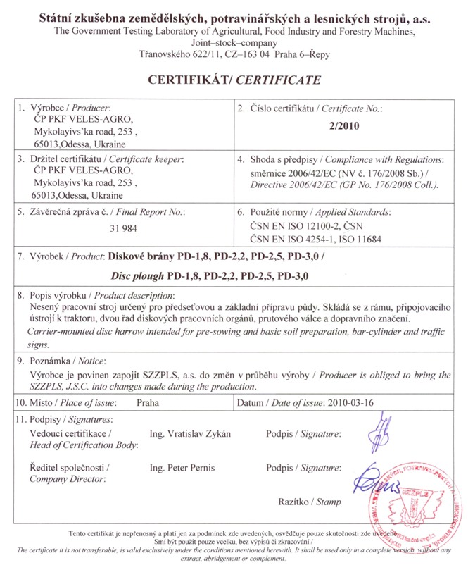 CSN EN ISO 12100‒2, CSN EN ISO 12100‒2/A1, CSN EN ISO 1050, CSN EN ISO 4254‒1, CSN EN ISO 11684