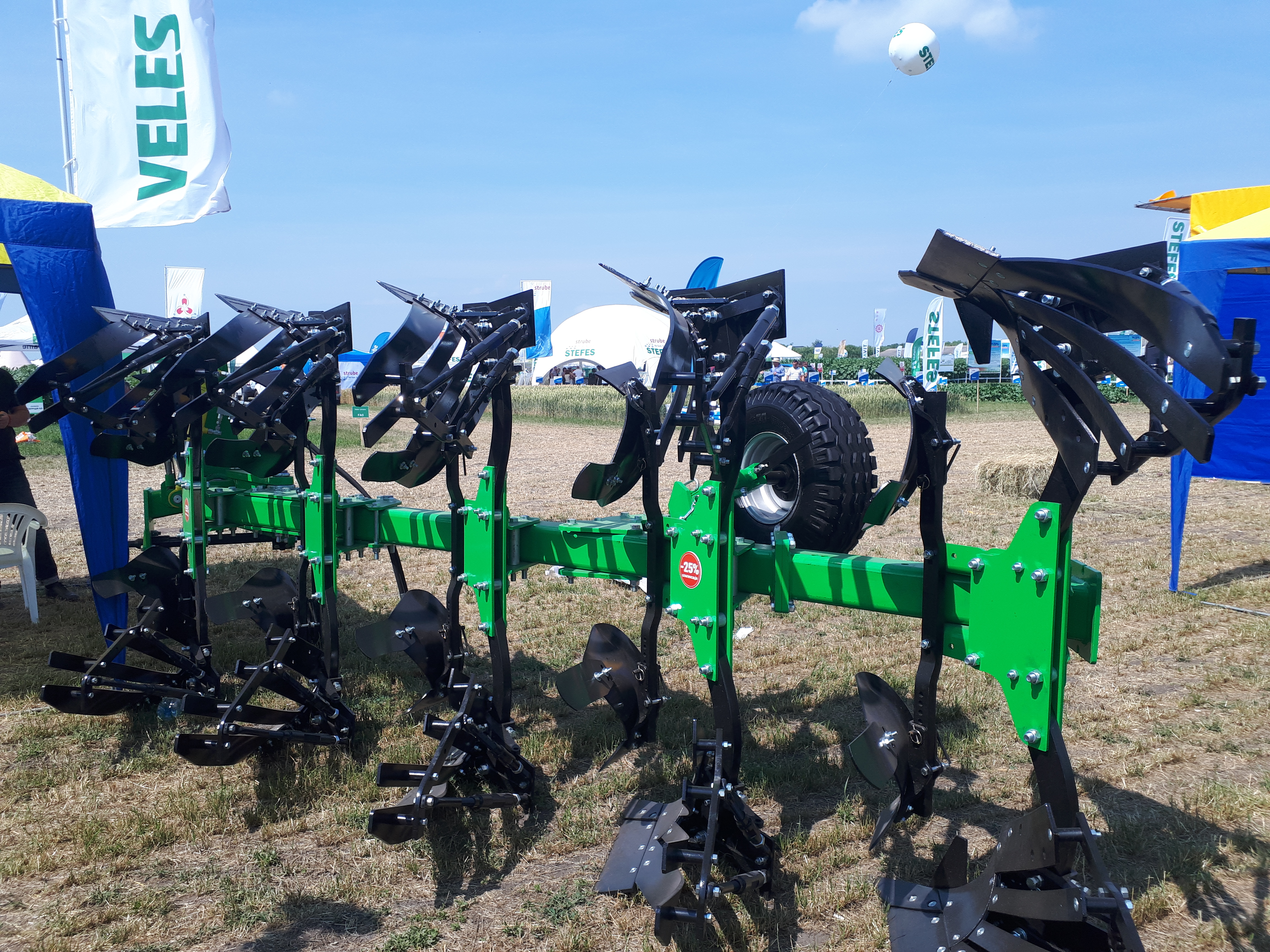 Wendepflug mit verstellbarer Arbeitsbreite (Vier-Stufen-Steuerung der Greiferbreite um 33, 38, 44 und 50 cm pro Gehäuse;) ist für glattes Pflügen von Böden für Getreide und Industriekulturen bis zu einer Tiefe von 35 cm ausgelegt, nicht verstopft mit Steinen, Steinplatten und anderen Hindernissen mit einem spezifischen Bodenwiderstand von bis zu 0,1 MPa (1 kg / cm²) und einer Härte von bis zu 4,0 MPa (40 kgf / cm²).