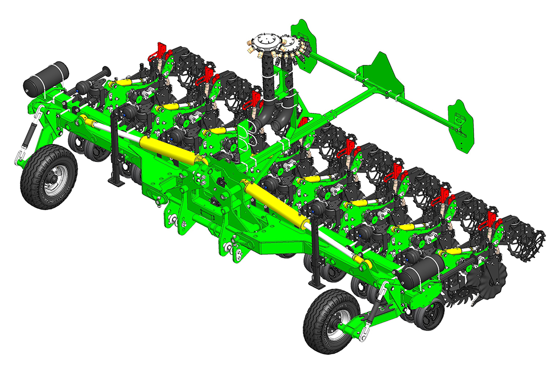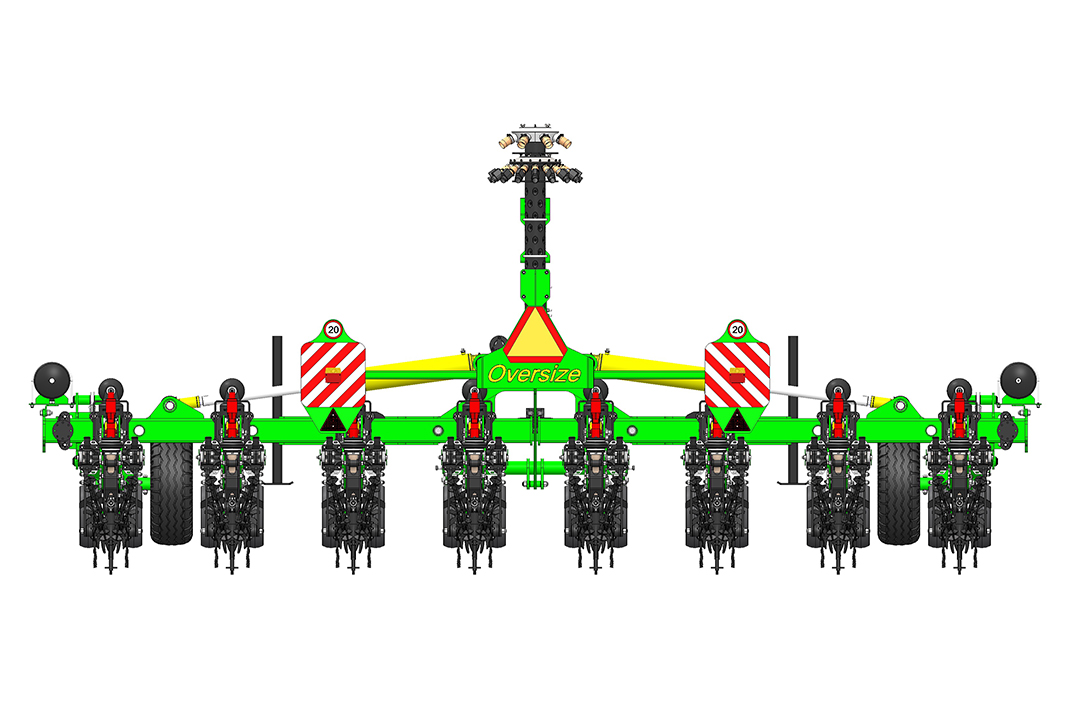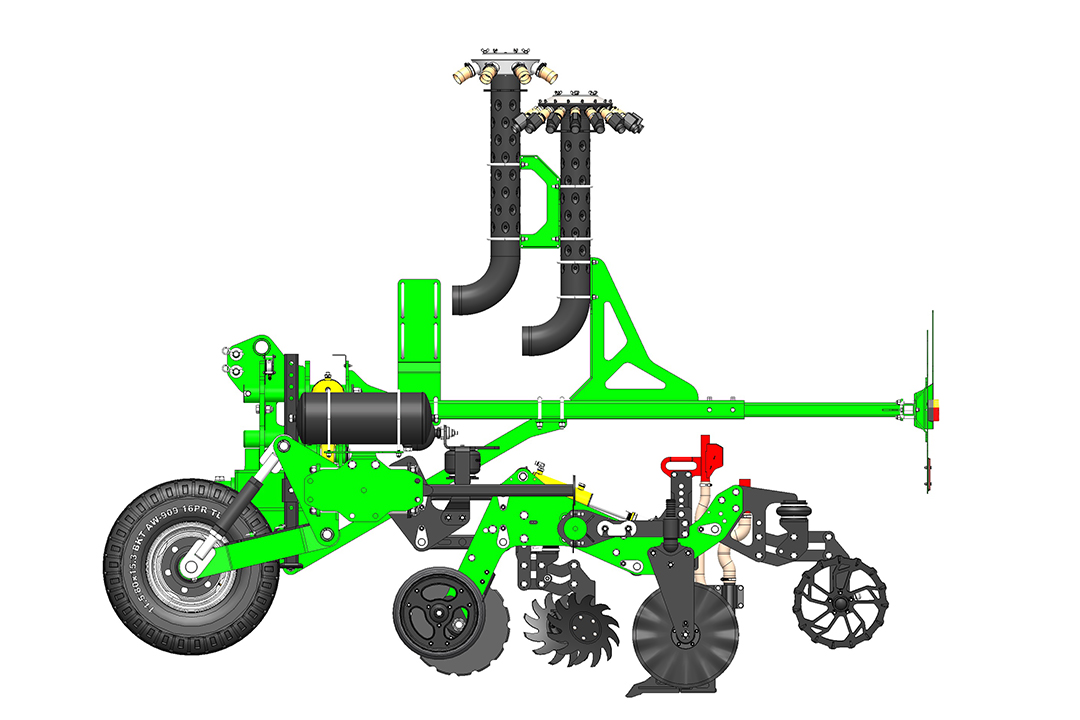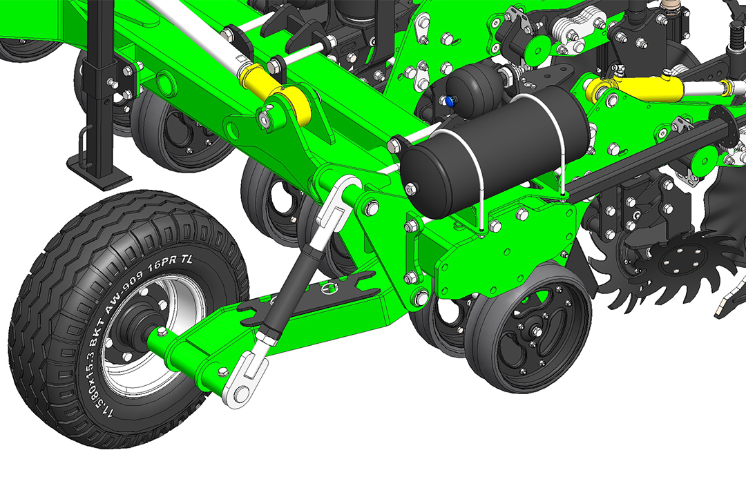 Die Sektion wird auf einem Parallelogramm mit einem pneumatischen Zusatzlader befestigt. Der Anpressdruck der festen Sektion gewährleistet eine konstante Arbeitstiefe und Düngerausbringung. Der größere Druck der auf der Traktorspur laufenden Teilbreiten kann separat eingestellt werden. Die gesamte Pneumatik wird von einem zentralen Bedienfeld in der Traktorkabine aus gesteuert.