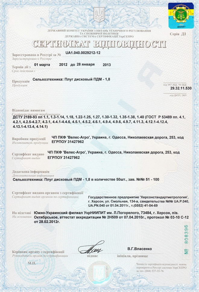 Сертифікат відповідності нормам ЄС з безпеки, виданий 16.04.2010.