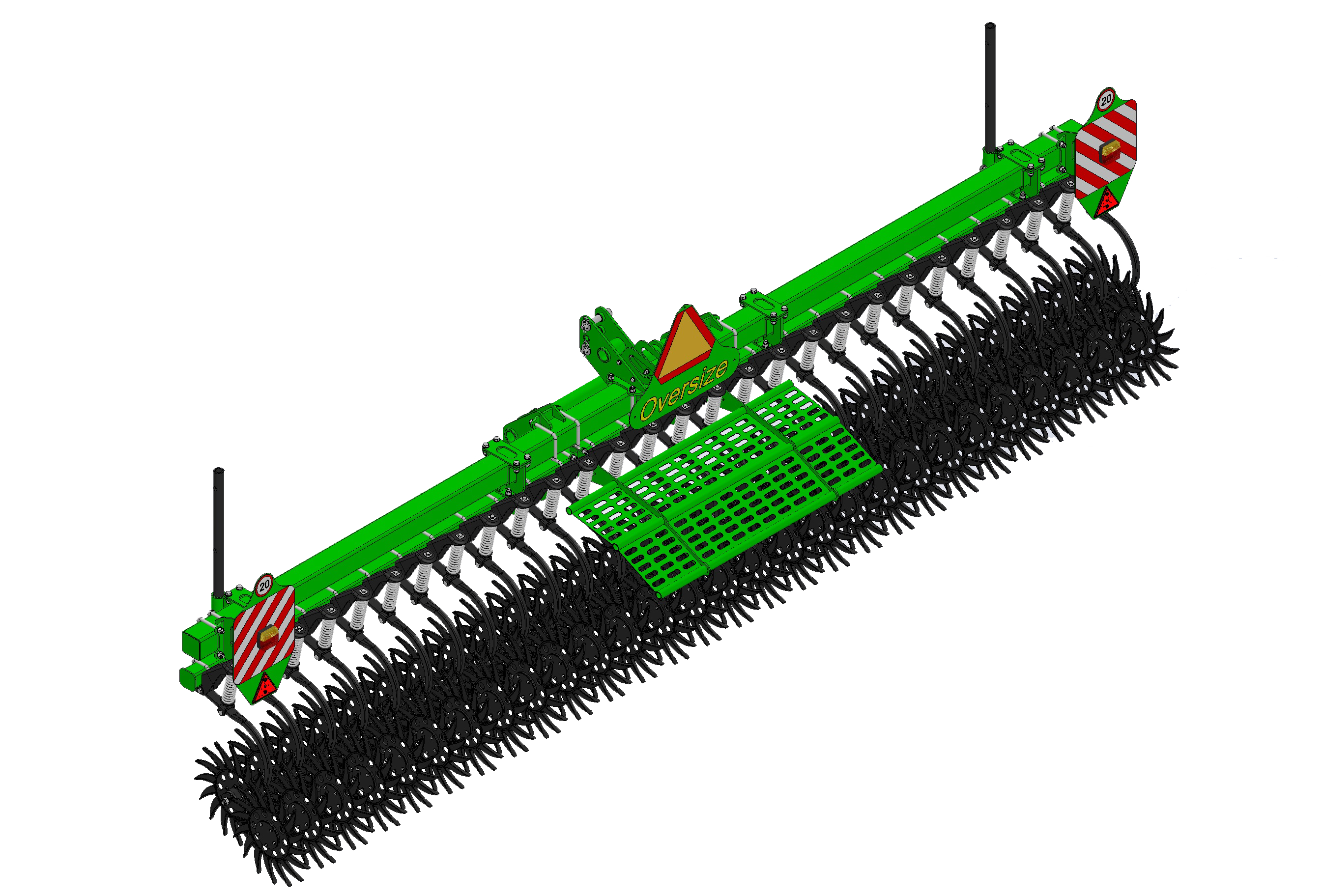 Игольчатый тандем рабочих органов, закрепленый на рабочем органе маятникового типа, позволяет идеально копировать обрабатываемую поверхность. Упругая стойка и пружинный узел безопасности минимизируют травмы растений во время обработки. Двухрядный подшипник рабочего органа с манжетным уплотнением не требует обслуживания и обеспечивает максимальный ресурс работы. Шпоры-колеса рабочего органа спроектированы так, чтобы углубляться в почву под углом, обеспечивая максимальный эффект погружения, мульчирование и рыхление поверхности поля. Барьерная сетка предотвращает попадание остатков в смотровое стекло и зеркала энергосредства.