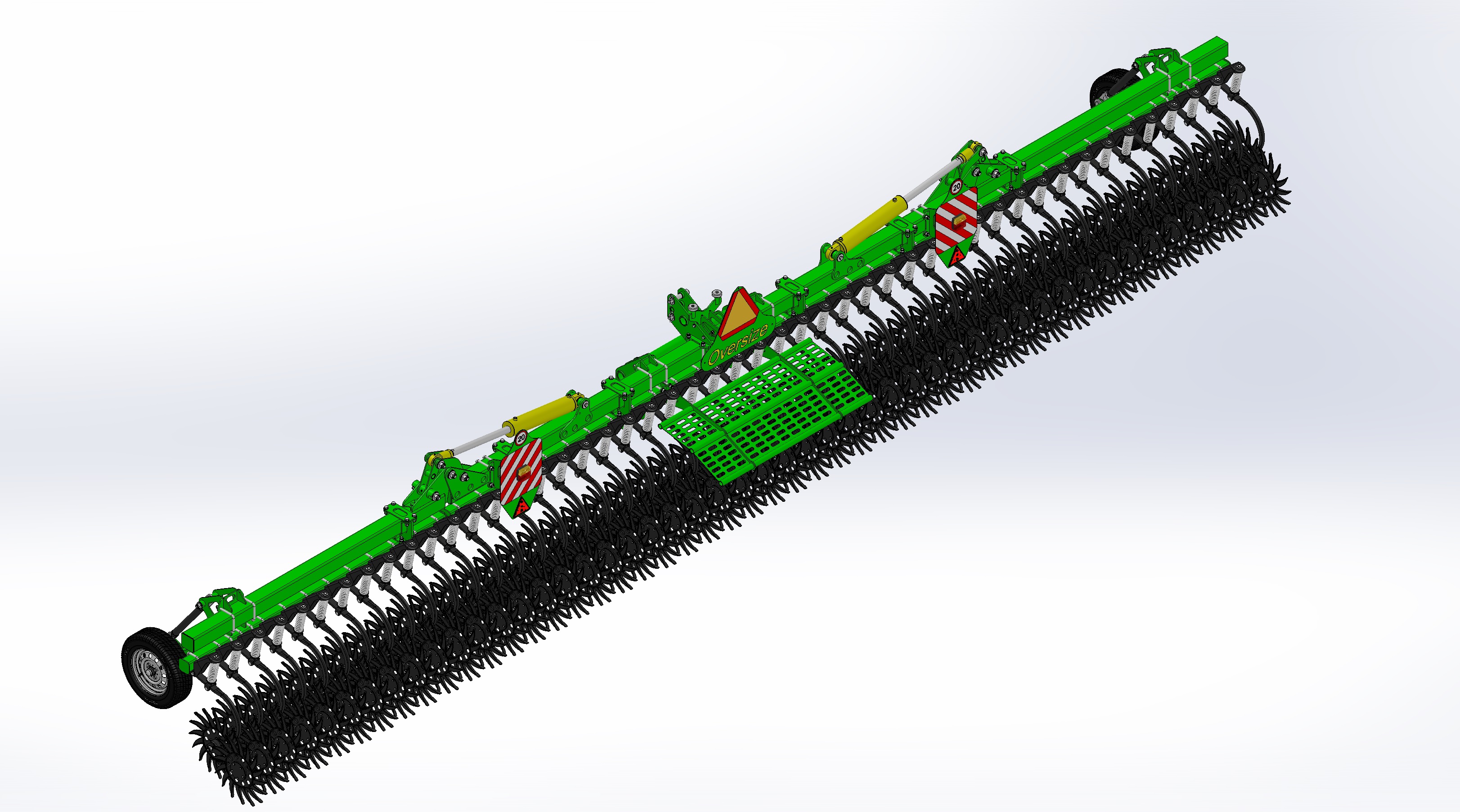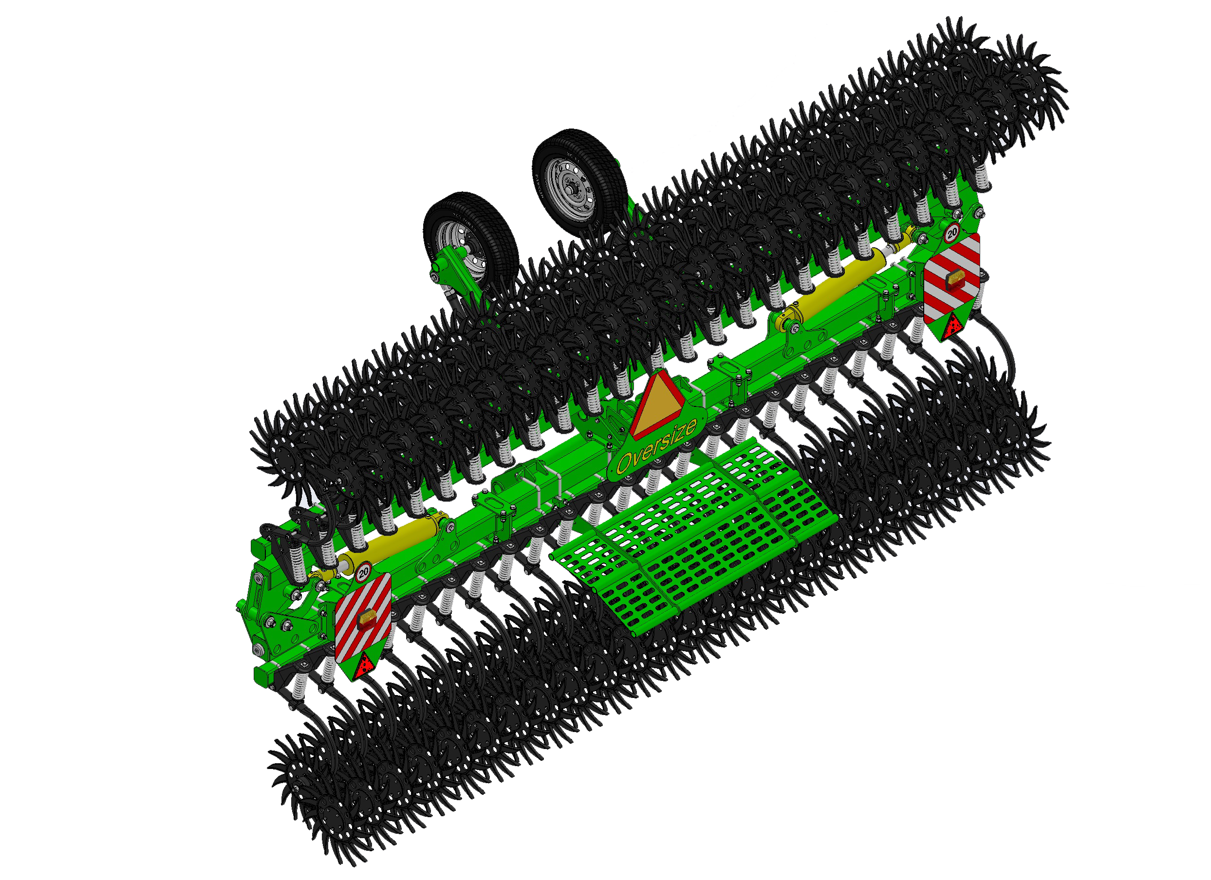 Игольчатый тандем рабочих органов, закрепленый на рабочем органе маятникового типа, позволяет идеально копировать обрабатываемую поверхность. Упругая стойка и пружинный узел безопасности минимизируют травмы растений во время обработки. Двухрядный подшипник рабочего органа с манжетным уплотнением не требует обслуживания и обеспечивает максимальный ресурс работы. Шпоры-колеса рабочего органа спроектированы так, чтобы углубляться в почву под углом, обеспечивая максимальный эффект погружения, мульчирование и рыхление поверхности поля. Барьерная сетка предотвращает попадание остатков в смотровое стекло и зеркала энергосредства.
