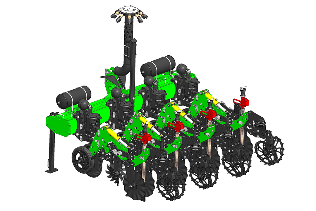 Секция закреплена на параллелограмме с пневматическим догружателем. Фиксированное давление для прижима секции обеспечивает устойчивое соблюдение глубины работы и внесения удобрений. Есть возможность отдельно настраивать больший прижим секций, идущих по колее трактора. Управление всей пневматикой происходит с одного централизованного пульта управления в кабине трактора.