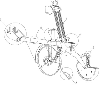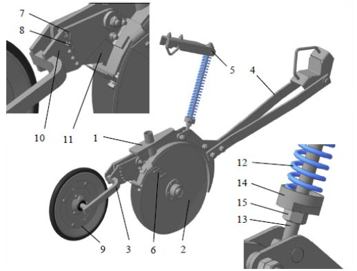 | 5. Importierte Federkraft auf Opener bieten 80 bis 120 kg, mit dem Sie den Bohrer auf Feldern mit Mini-till verwenden können, und No-till. | Anpassen der Kompression (download) erlaubt Ihnen, Druck in den 50 bis 60 kg auf dem Opener erstellen. |