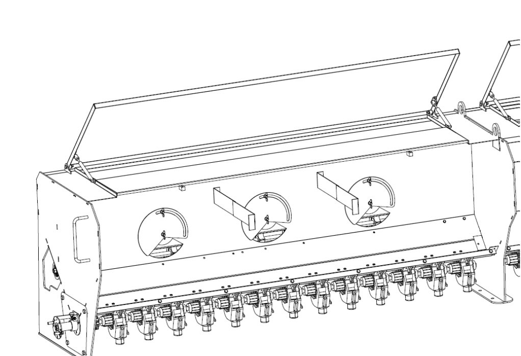 Eine gemeinsame Deckel auf den Behälter, breiter Sediment Hals, reversible Innendeckel für einfache Befüllung des Trichters, die durchschnittliche Wand mit peresypnymi Luken können Sie beide Trichter für Saatgut zu verwenden. |