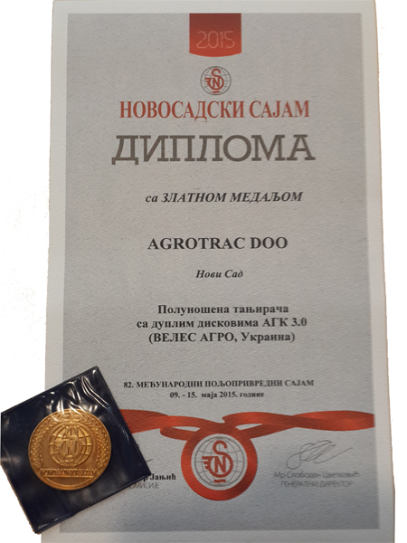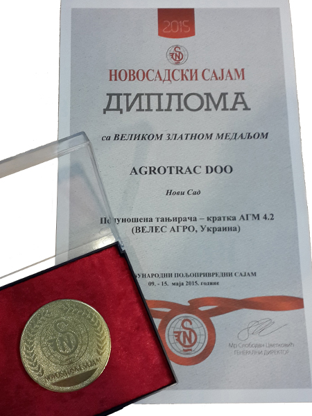 Während der Teilnahme an der 82 th Internationale Landwirtschaftsmesse Sajam 2015 in Serbien, der Bewertung der Kommission wurde beschlossen, den Fachhändler «Veles-Agro» — «AGROTRAC d.o.o.» in Serbien, Goldmedaillen engagierten Bodenbearbeitungsmaschinen: AGM 4.2 und AGK 3.0. Auszeichnungen symbolisieren die Verarbeitung und einfache Handhabung in einer breiten Palette von Einheiten.