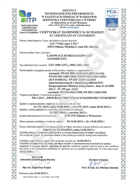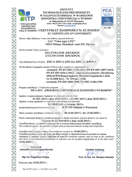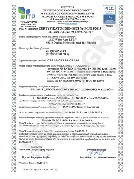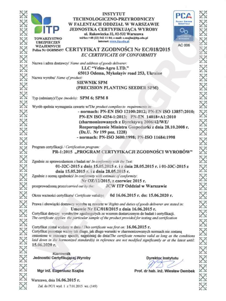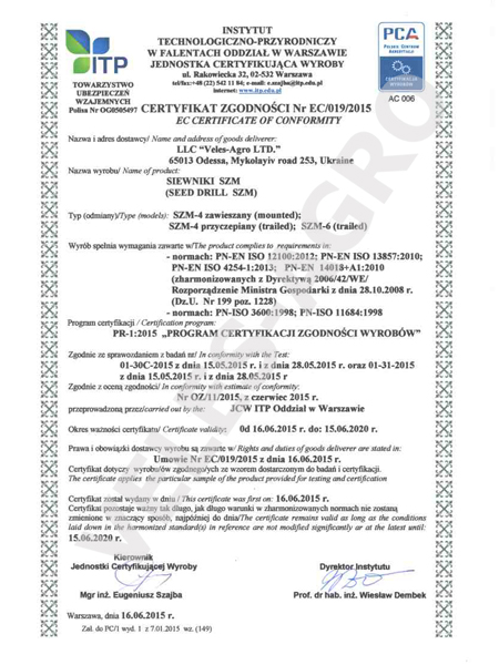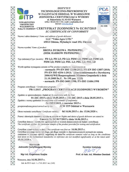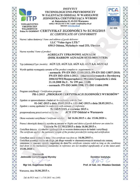 The manufacturer of tillage and seeding equipment LLC «Veles-Agro LTD.» Has completed the certification for compliance with European standards, with the result that the company received European seritifikaty security for its products: disc harrows, seed drills and precision planting seeder, reversible ploughs, subsoilers, cultivators and loaders.