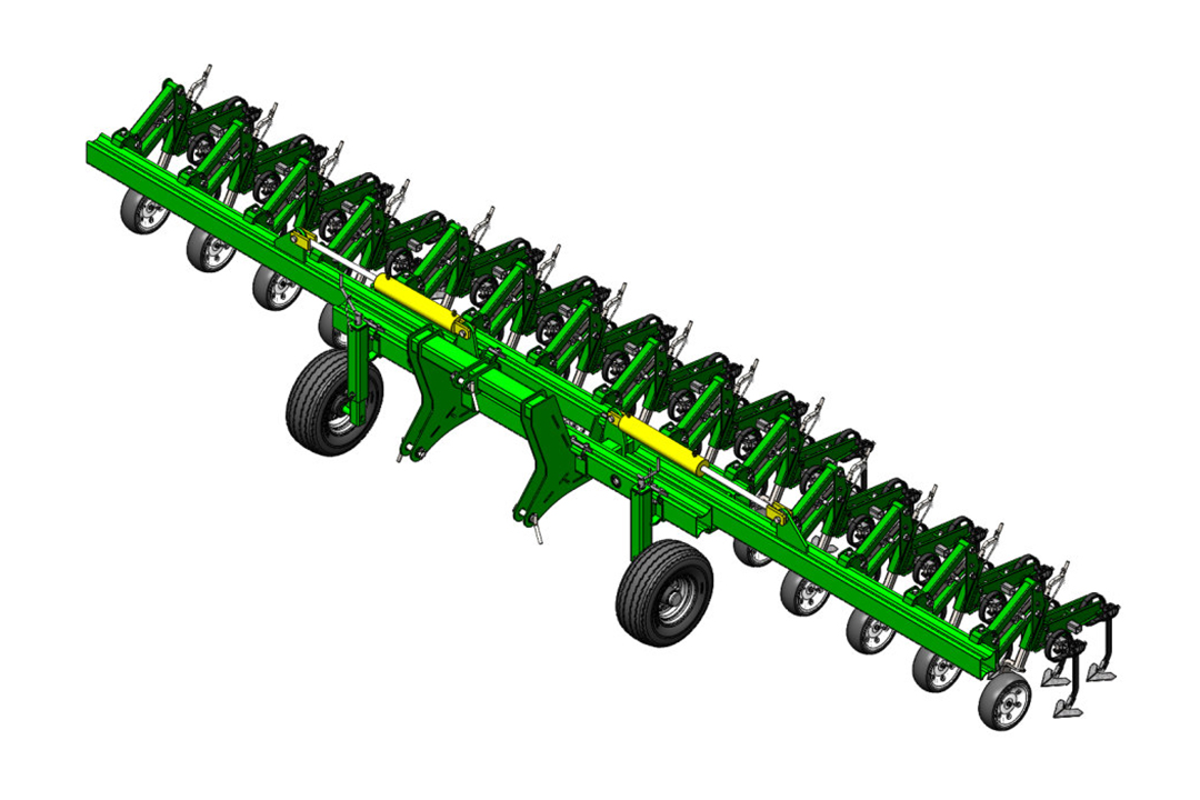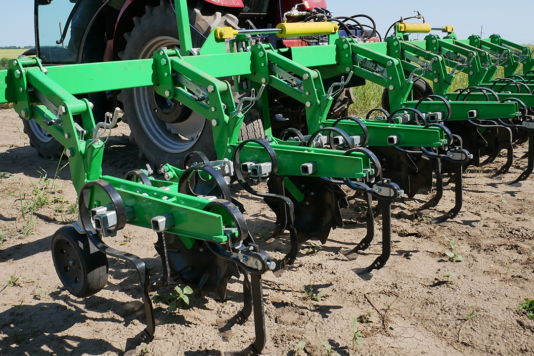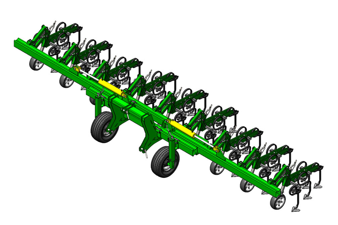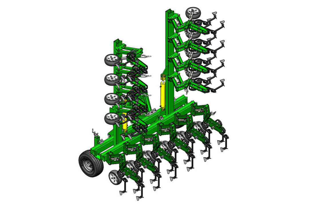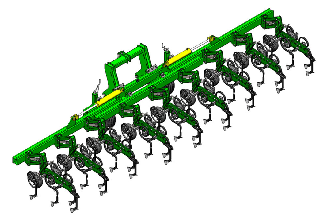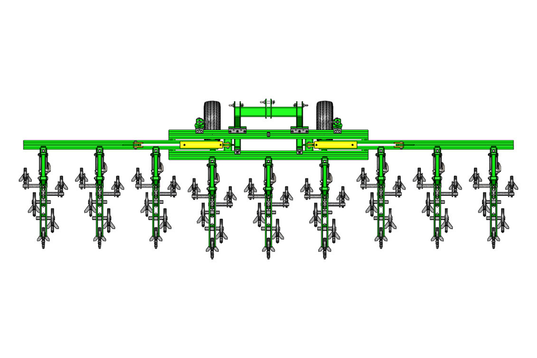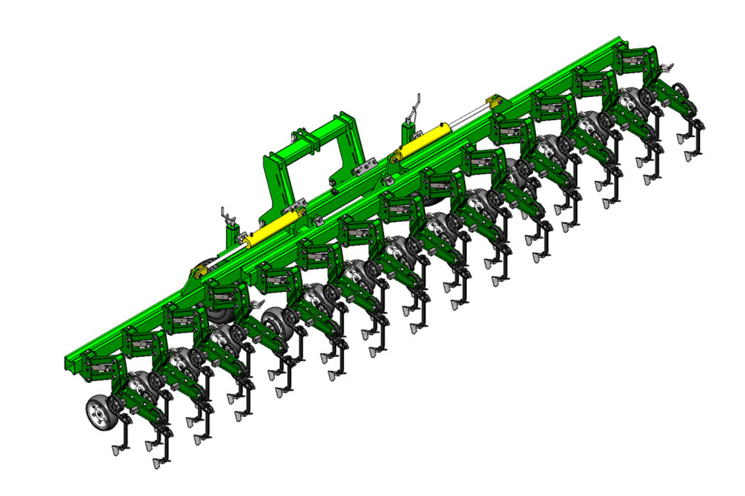 The tine sections have a parallelogram design and are bolted to the frame with a single bolt for very easy row spacing adjustment. Each section is equipped with infinitely height-adjustable support wheels that follow the contour of the soil, guarantee a constant working depth and allow you to work in high humidity without soil sticking. Cultivator shares are mounted on S-shaped spring tines and are made of high-strength steel with increased wear resistance. Infinitely adjustable spread of shares across the width of the section provides a better «overlap» of the processing area. Protective discs (optional) with a diameter of 430 mm provide good protection for plants in the initial growth phase.