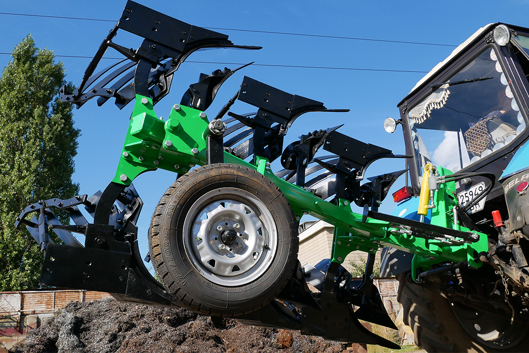 The plow blades have a strip structure, which makes it possible to loosen the soil more intensively in conditions of high humidity, without leaving continuous layers. The working body is equipped with screw regulators that allow you to adjust the width and angle of the blade (250/280/325/360 mm for each body).
