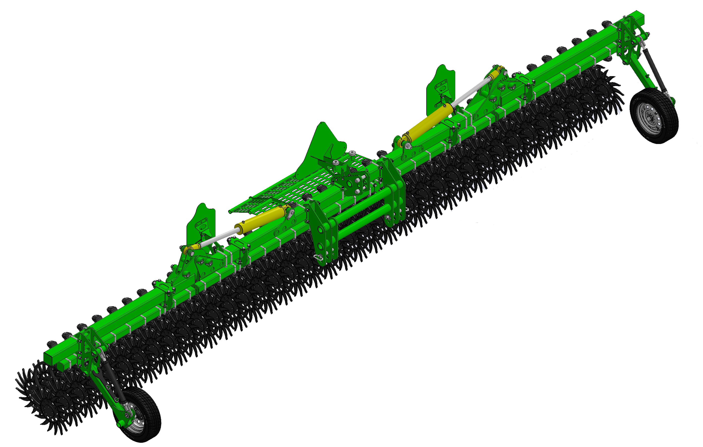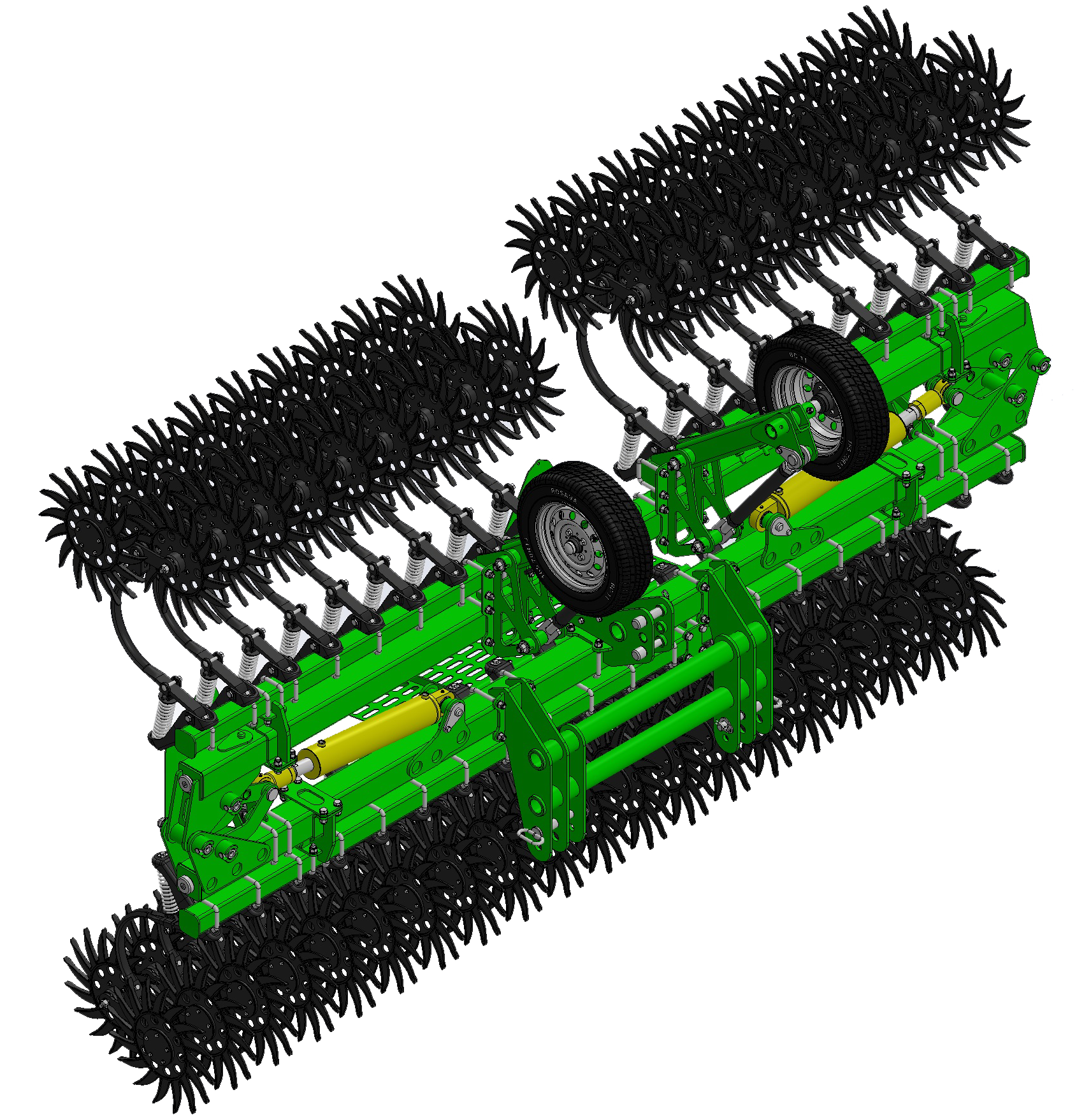 The needle tandem of the working bodies, attached to the working body of the pendulum type, allows you to perfectly copy the work surface. The elastic strut and spring safety assembly minimizes plant injuries during processing. The two-row bearing of the working body with a lip seal does not require maintenance and provides maximum service life. Spur-wheels of the working body are designed to penetrate into the soil at an angle, ensuring maximum immersion, mulching and loosening of the field surface. The barrier mesh prevents residues from entering the viewing glass and power mirrors.
