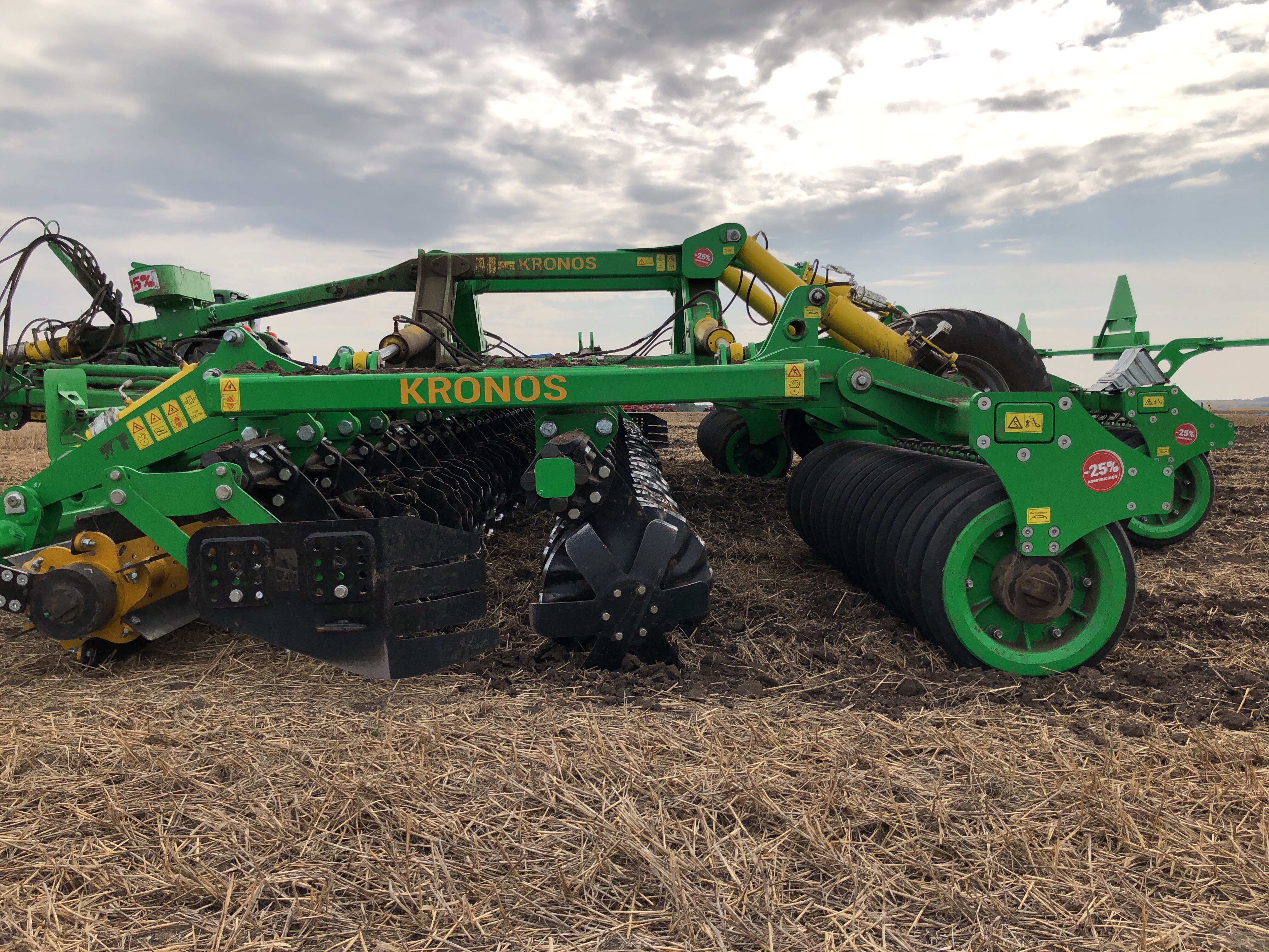 Компактні дискові борони серії KRONOS призначені для якісного поверхневого та передпосівного обробітку ґрунту. Тандемні дискові робочі органи закріплені на рамі через гумові амортизатори, що забезпечує розпушування ґрунту з незначними енергозатратами та знижує динамічні навантаження на підшипникові вузли. Диски встановлено на відстані 220 мм (110 мм по сліду) з кутом атаки 17 град, що гарантує повне підрізання рослинних решток та ґрунту. Зворотне ущільнення поверхні та розрихленого шару ґрунту виконується котком. Механізм копіювання поверхні рельєфу поля опирається на коток, що гарантує стабільність дотримання заданої глибини обробітку по всій ширині захвату агрегату. Виконання поверхневого обробітку ґрунту компактною дисковою бороною забезпечує збереження вологи у верхніх шарах, захищає ґрунт від непродуктивних її втрат; створює сприятливе ґрунтове середовище для проростання насіння бур’янів та розвитку мікрофлори; прискорює процеси перегнивання рослинних решток та збереження родючості ґрунту. При лущенні стерні зернових за один прохід агрегата забезпечується стан ґрунту, що відповідає вимогам до цієї операції в найсучасніших агротехнологіях. Стабільність та рівномірність дна обробітку дозволяє рекомендувати KRONOS і для виконання передпосівної культивації.