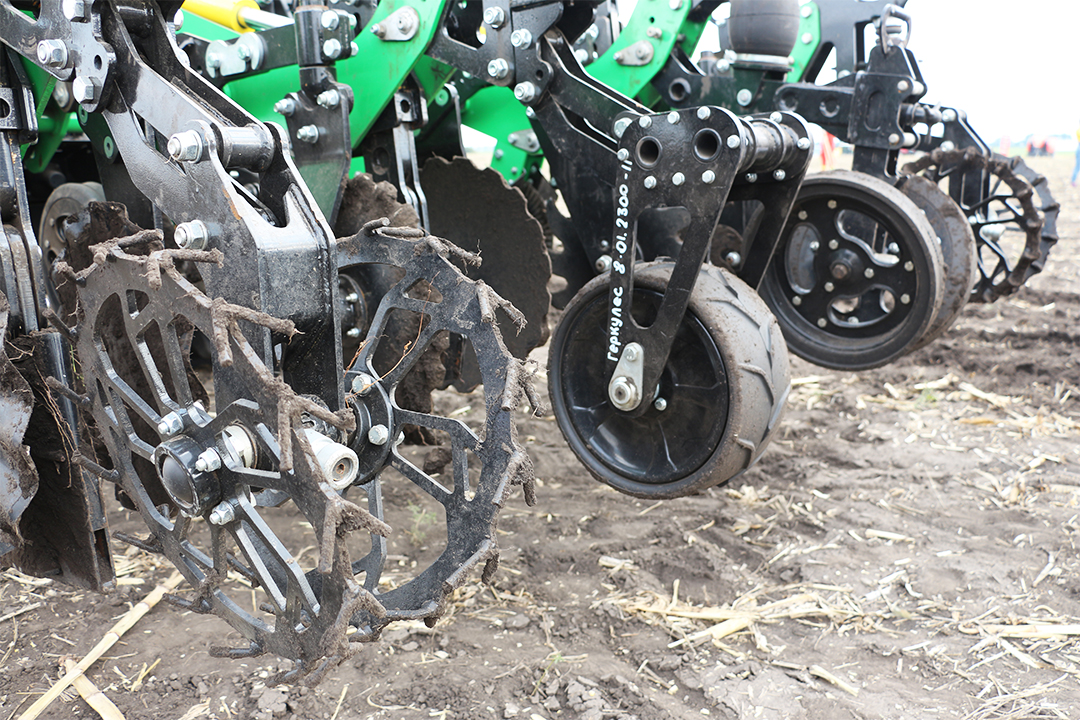 Очисники ряду виносять пожнивні рештки на міжряддя, що в подальшому сприяє акумулюванню та затриманню вологи. Вони мають паралелограмну підвіску, за рахунок цього зберігають постійними кути роботи дисків і максимально плавно та точно копіюють рельєф. Диски очисника стоять зі зміщенням для забезпечення повного перекриття робочої зони і мають додаткове регулювання за висотою. Диски мають спеціальну увігнуту форму зуба, який перешкоджає розколюванню пожнивних залишків. Є можливість безступінчастого регулювання робочого притиску за рахунок пневмоподушки з керуванням із централізованого пульта.