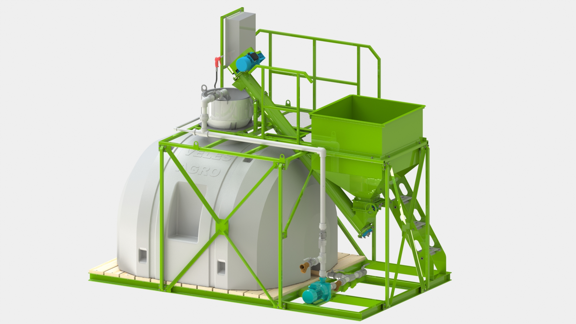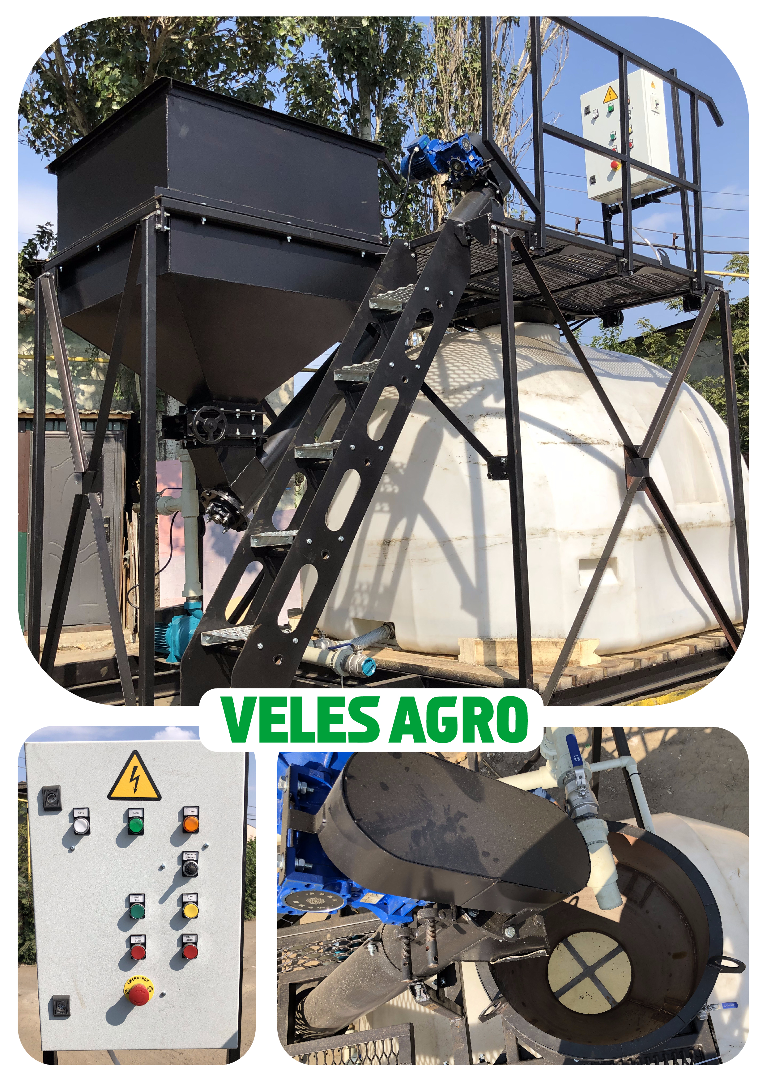 Принцип работы узла основан на гидродинамическом растворении сухих веществ раствором с минимальной концентрацией. Удобрения подаются в реактор шнековым транспортером со встроенной в дно реактора мелкой сеткой. За счет постоянного завихрения потока жидкости происходит вымывание раствора. Подача сухих удобрений регулируется частотным преобразователем скорости работы двигателя.