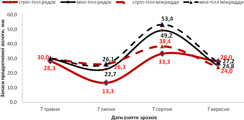 В період посіву запаси в загальному шарі ґрунту (0‒16 см) були практично одинакові в технології strip-till та mini-till. Але, в подальшому продуктивна волога по технології strip-till знижувалась, при цьому різниця зростала в процесі розвитку рослин, але на період збирання вирівнялась. На наш погляд стан грунтового середовища в варіанті strip-till (розрихлена зона рядка та природна в міжрядді) створювали більш оптимальний і ефективніший процес забезпечення вологою та повітрям і вегетативна маса наростала швидше і рослини поглинали більше води. Коли вегетація рослин підійшла до завершального етапу (дозрівання) ситуація вирівнялась.