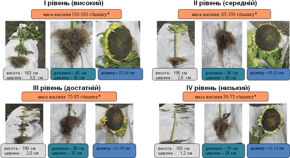 На 120 день вегетації отримано рослини соняшнику по двом досліджуваним технологіям, які по різним характеристикам (розмір стебла, довжина кореневої системи, діаметр шапки, маса насіння в шапці) умовно можна поділити на 4 рівні (мал. 6).