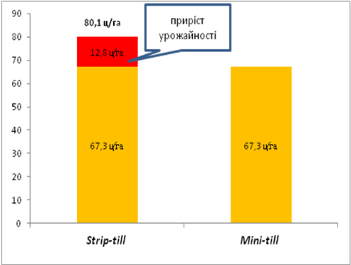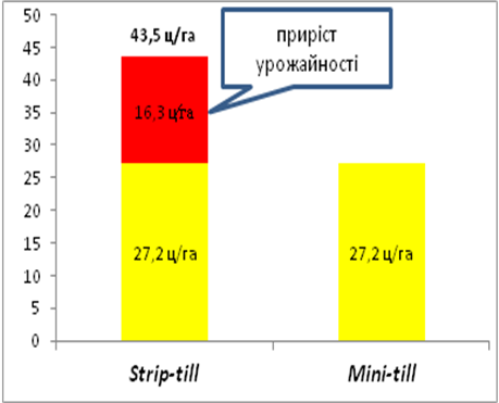 Таким чином, зафіксовані позитивні зміни в фізико-механічних характеристиках грунту в період основного обробітку, оптимальне забезпечення рослин вологою та сприятливий режим живлення, наявність більшої частки розвинених рослин на полі при застосуванні технології strip-till, навіть не зважаючи на несприятливі погодні умови, логічно завершились значним приростом врожаю як соняшнику так і кукурудзи: біологічний врожай соняшнику на 40% вище, а кукурудза відповідно на 20%.